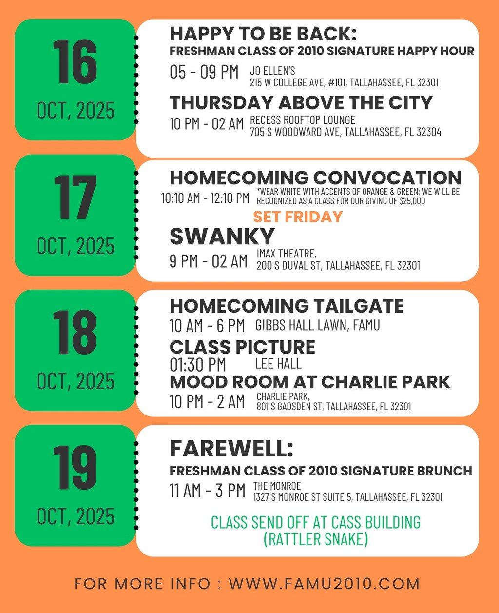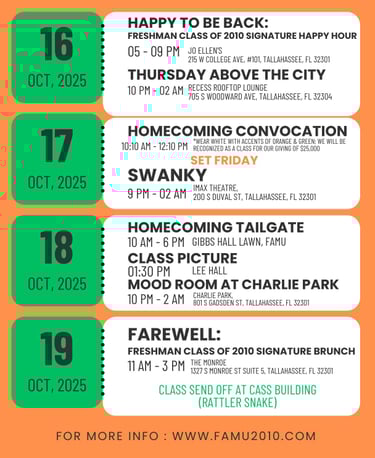 Mark your calendar for October 15th-19th, 2025 for five (5) days of memories to last you a lifetime. Seize this rare moment to reconnect with the people who shaped your journey!